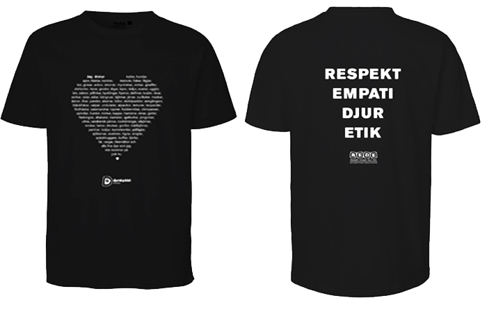 T-shirt för den riktiga djurvännen. På framsidan – en text med vilka djur som älskas formad som ett hjärta. På baksidan – vårt värdegrundsmaterial REDE’s ledord. (Respekt, Empati, Djur, Etik)