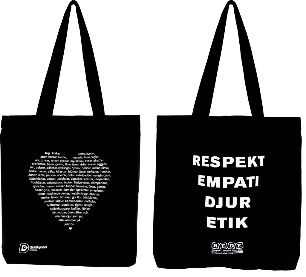 Tygpåse för den riktiga djurvännen. Ena sidan med en text med vilka djur som älskas formad som ett hjärta. Den andra sidan med vårt värdegrundsmaterial REDE’s ledord. (Respekt, Empati, Djur, Etik)